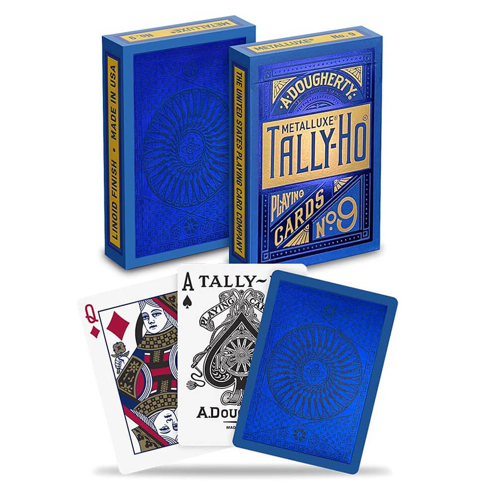 Los naipes Tally-Ho MetalLuxe son la baraja de naipes coleccionables de lujo definitiva. Los naipes Tally-Ho MetalLuxe cuentan con el clásico y hermoso diseño circular de Tally-Ho en una lámina metálica de edición de coleccionista. El estuche y el reverso de la tarjeta están estampados con lámina de metal real para lograr un brillo deslumbrante. El estuche presenta una hermosa y llamativa lámina azul real, así como una brillante lámina dorada, mientras que el reverso de las cartas está estampado con una impresionante lámina azul para crear el clásico diseño Tally-Ho Circle Back.