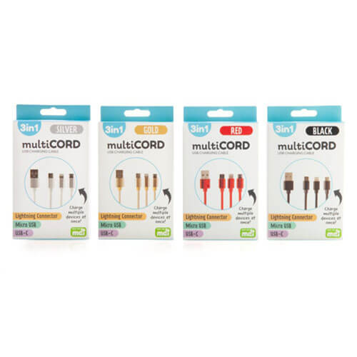 Cable de carga multifuncional con 3 tipos de conectores diferentes.