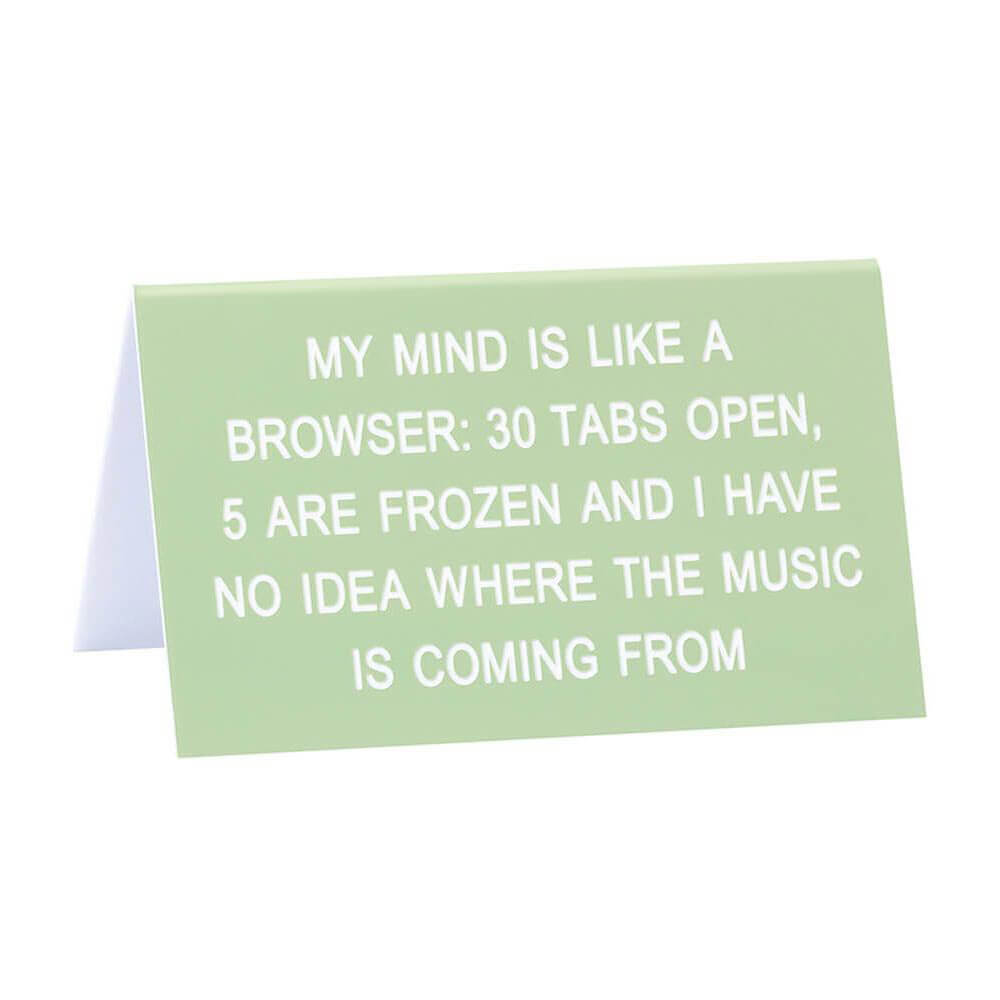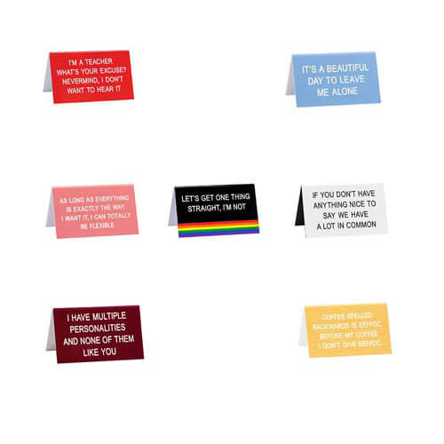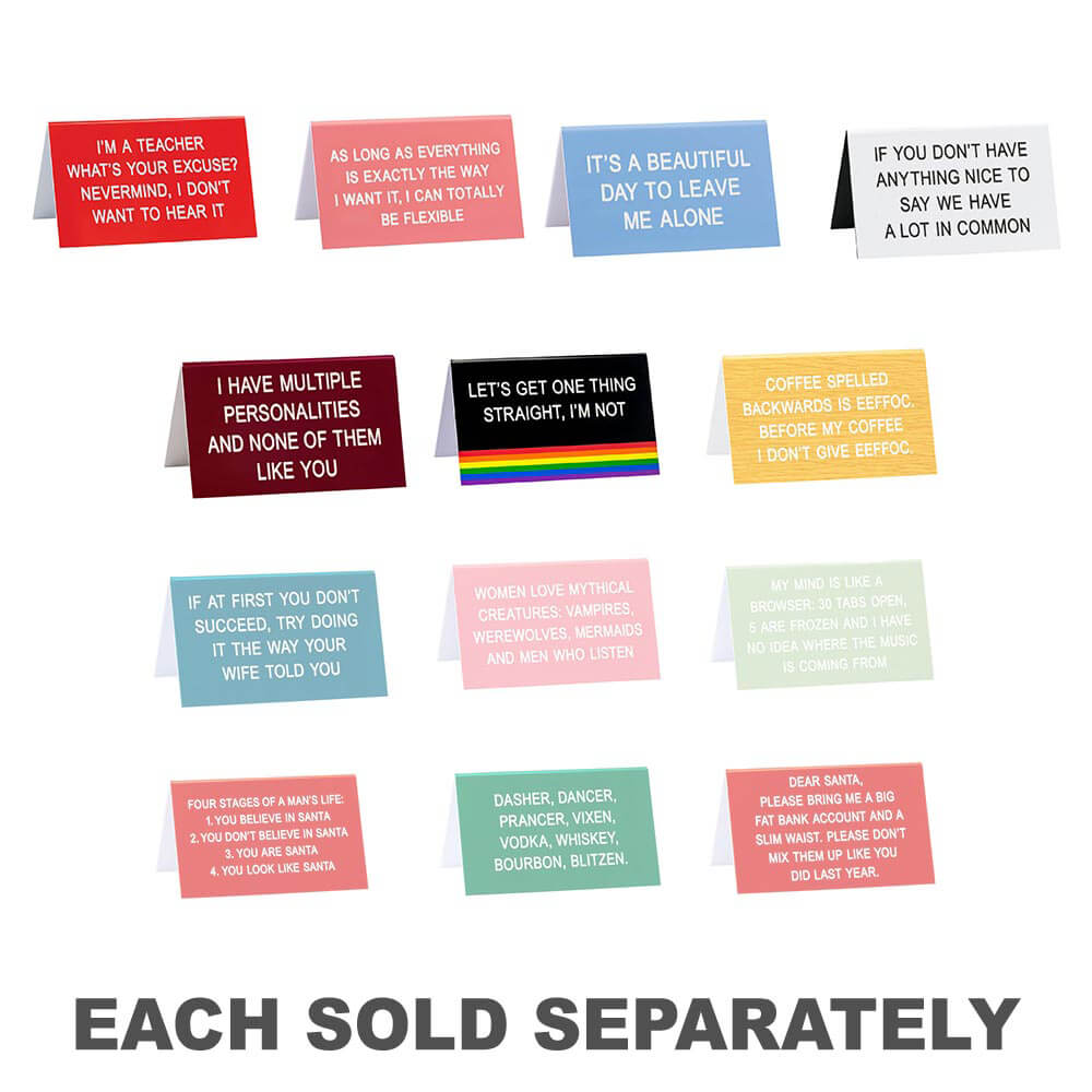 Rompe la monotonía del trabajo y trae algunas LOLs a la oficina con este letrero de escritorio en color burdeos de SAY WHAT?. El título dice: "Tengo múltiples personalidades y a ninguna de ellas le gustas". El producto mide 11,5 cm x 7 cm.