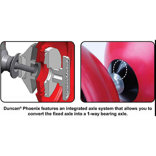 • RODAMIENTO INTERCAMBIABLE: Los jugadores de diábolo ya no tendrán que elegir entre un eje fijo y un diábolo con rodamiento unidireccional. El exclusivo diseño de cojinete intercambiable Duncan Phoenix Diabolo le permite apretar fácilmente las perillas del para cambiar los ejes entre fijo y giratorio.