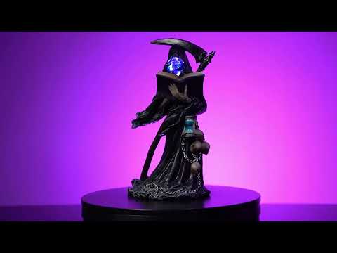 Misteriosa parca sosteniendo una guadaña y una linterna LED. Encaramado sobre una luna creciente hecha de múltiples cráneos. Hecho de poliresina resistente con una sensación lujosa y pesada.