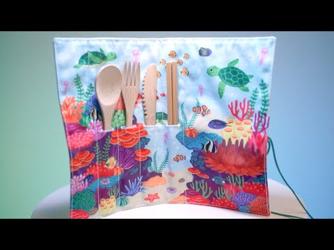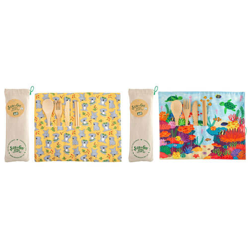 • Juego de cubiertos ecológicos hechos de bambú, con un envoltorio de viaje que también funciona como mantel individual.