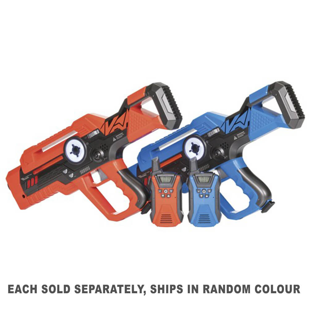 La acción de los videojuegos salta de la pantalla a tu patio trasero. ¡Los jugadores 1, 2, 3 y 4 han entrado en la batalla! Con receptores de infrarrojos incorporados para rastrear impactos y múltiples modos de armas para usar en combate, estas armas mantendrán a todos activos y en movimiento. Estas armas tienen todos los sensores integrados, por lo que no hay necesidad de placas para el pecho ni sensores adicionales en el cuerpo. Este kit también incluye 2 walkie talkies del mismo color para que puedas comunicarte con tus compañeros de equipo durante la batalla.