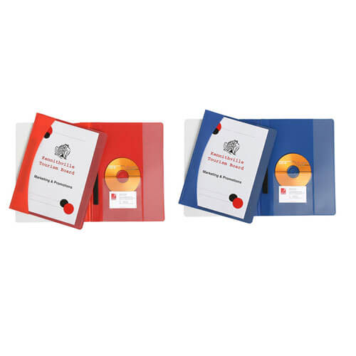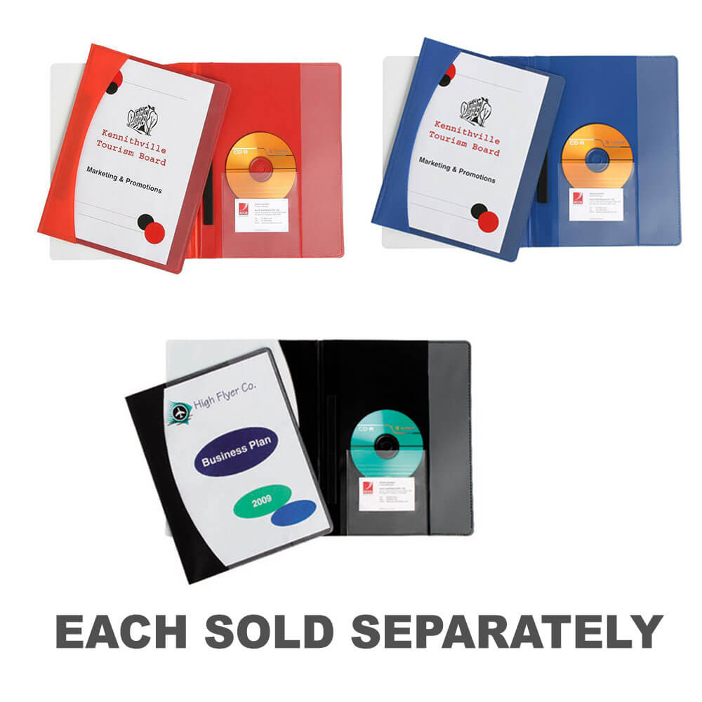 - Semi rígido con cubierta frontal transparente. Cubierta trasera interior con bolsillo vertical, soporte para CD y soporte para tarjetas de presentación.