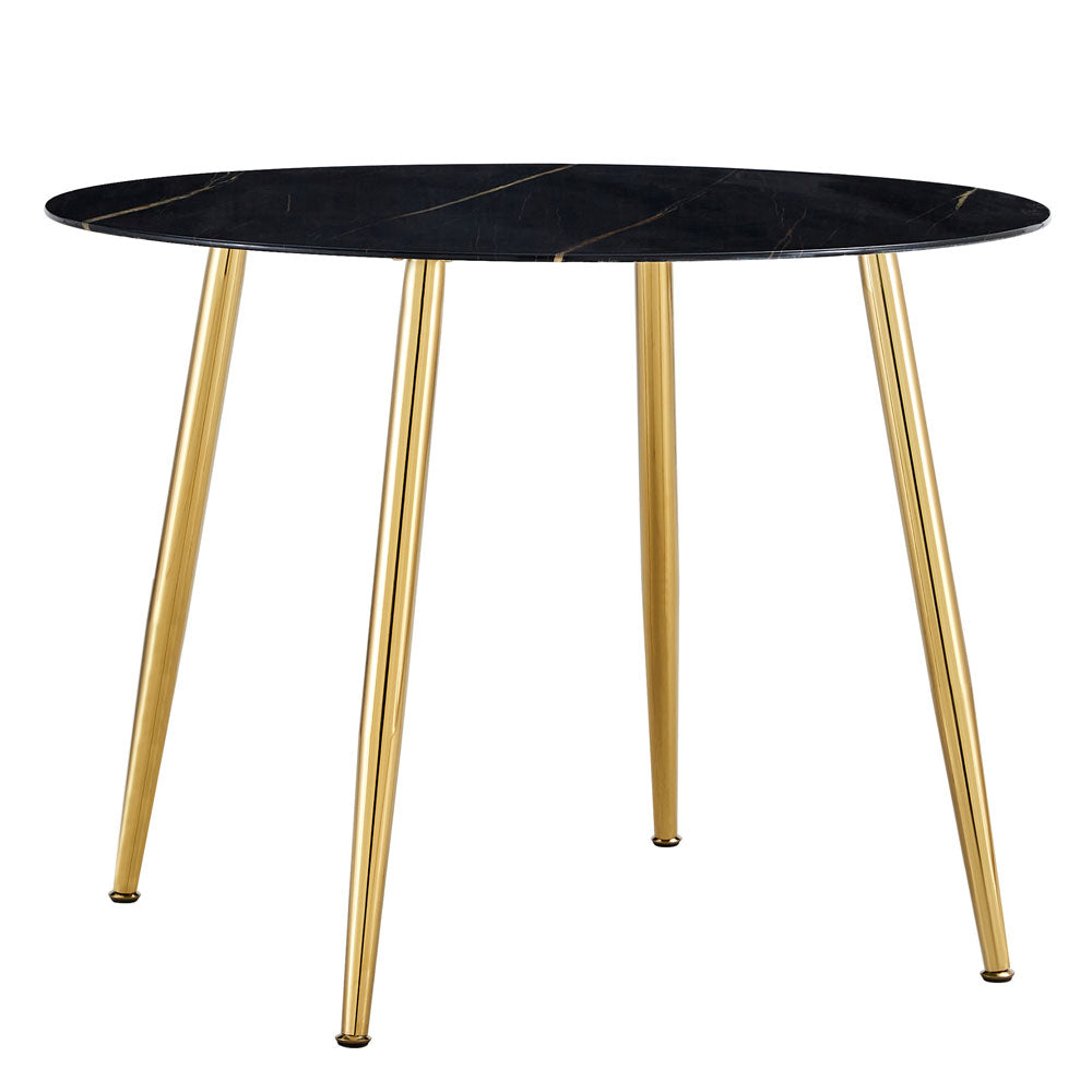 Mejore su comedor con el diseño ultra moderno de esta mesa de vidrio. Su estilo versátil se integra perfectamente en diferentes entornos, elevando su espacio con un toque contemporáneo. Esta mesa de cocina de vidrio es una gran combinación de tapa de vidrio templado de mármol negro y patas de metal de oro resistente. Tiene un diseño elegante y simple, que podría ser adecuado para diferentes diseños de casas. Como una pequeña mesa de comedor, es ideal para un comedor de espacio limitado; Es un tamaño perfecto para la mayoría de las salas de estar, balcones o comedores como mesa de recepción, mesa de café o mesa de cocina. Tiene una gran combinación de vidrio de seguridad templado de alta calidad (0.3 pulgadas) y marco de metal resistente al óxido con gran fuerza y durabilidad. Las puntas de las piernas ajustables para proteger el piso y mantenerlo estable. El set viene completo con todos los accesorios necesarios para el ensamblaje. También viene con instrucciones fáciles de entender que puede seguir. Solo tarda 10-15 minutos en configurar e instalar.
