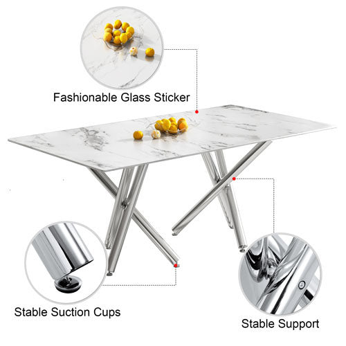 Agregue un toque de modernidad y elegancia a su comedor con esta mesa de comedor. Tiene una mesa de vidrio con un acento de grano de madera, que va bien con la mayoría de los interiores y se puede combinar con la mayoría de las sillas de comedor. Esta espaciosa mesa de comedor de 70 "ofrece mucho espacio para reuniones y asientos cómodamente 6-8 personas, proporcionando un amplio espacio. Para comidas agradables, reuniones familiares o entretenidas a los invitados. Fuing un soporte resistente en el centro, esta mesa puede soportar un peso pesado. Pristine y hermosa. Esta versátil mesa de comedor no solo es adecuada para las comidas, sino que también sirve como un espacio de trabajo elegante para diversas actividades y agrega un toque de sofisticación a su comedor, complementando una amplia gama de estilos interiores y esquemas de color