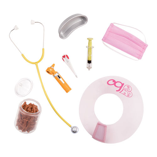¡Ayudar a las mascotas a mantenerse saludables! Anais usa su uniforme veterinario con una camiseta de manga larga blanca, uniforme de veterinario rosa "Scrubs" Top and Pants, y zapatos planos cómodos para ayudarla a permanecer en sus pies. Ella viene con muchas herramientas y accesorios veterinarios para ayudarla a cuidar a los animales, como un estetoscopio, un collar para poner en cachorros o gatitos, un otoscopio con una luz de trabajo para revisar las orejas de su paciente, ¡y más!