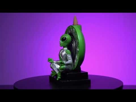 Quemador de incienso de reflujo con un peculiar diseño alienígena meditando. Alien viste un traje cósmico plateado y se sienta frente a un diseño zen verde y plateado. Un humo fragante fluye hacia abajo y alrededor del alienígena cuando se coloca un cono de incienso encendido encima. Apto para conos de incienso.