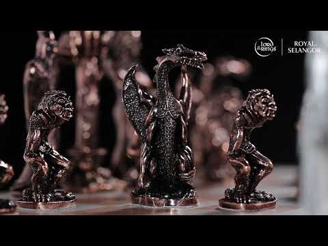 Comienza la batalla por la Tierra Media. Aragorn y Galadriel lideran una banda de Ents, Magos y Hobbits contra la horda de Saruman, Gollum, Dragones y Orcos de Sauron y Shelob. Fundido en peltre, con revestimiento de cobre para distinguir los ejércitos contrarios, el juego se desarrolla sobre un tablero de ajedrez de madera y marquetería de peltre.