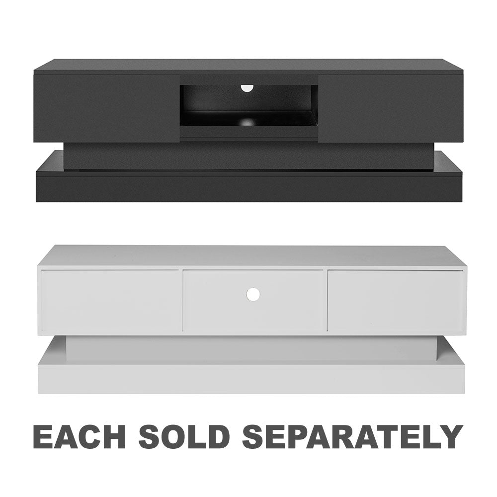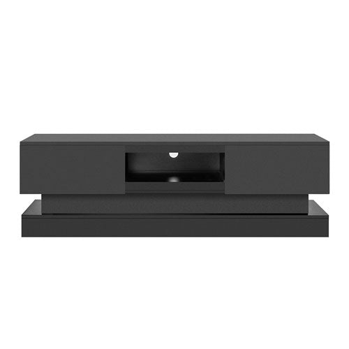 Featuring a modern and simple design, this TV Stand with LED fits with different room themes, and the LED lights could create a different atmosphere for your room.This TV stand with LED comes with 16 RGB LED backlights and 4 light modes. You can change the lights settings using a remote control, making it easy and convenient to set the mood.This TV console fits up to a 65-inch TV. It has a spacious tabletop and 2 large storage drawers that satisfy all your display and storage needs in the bedroom or living room.Made of P2-grade particleboard, this TV stand is scratch-proof waterproof, and easy to maintain. The modern and minimalist structure also provides great stability, with up to 110 pounds bearing capacity.The set comes complete with all the accessories needed for assembly. It also comes with easy-to-understand instructions that you can follow. It only takes 10-15 minutes to set up and install.