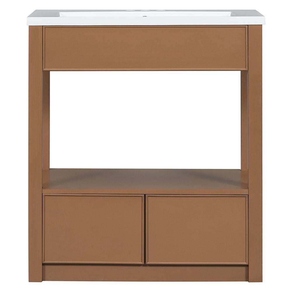 Constructed with a combination of solid wood and MDF boards, this cabinet ensures exceptional stability and longevity. The painted finish surface not only adds aesthetic appeal but also offers water-proof and stain-proof properties, making cleaning a breeze.The white ceramic sink is crafted with precision and features an overflow and three faucet holes. Its smooth surface is easy to clean, allowing you to maintain its pristine condition effortlessly. The sink is designed to accommodate a 4" centered faucet (faucet not included).Combining beauty and practicality, this bathroom vanity features a brown body with an open construction in the middle. The open back design simplifies plumbing, providing convenience during installation and maintenance.With storage in mind, this vanity cabinet offers versatile storage spaces. It includes an open shelf and two drawers with slide rails, allowing you to organize and store soaps, towels, shampoos, and other bathroom essentials. Keep your items ne