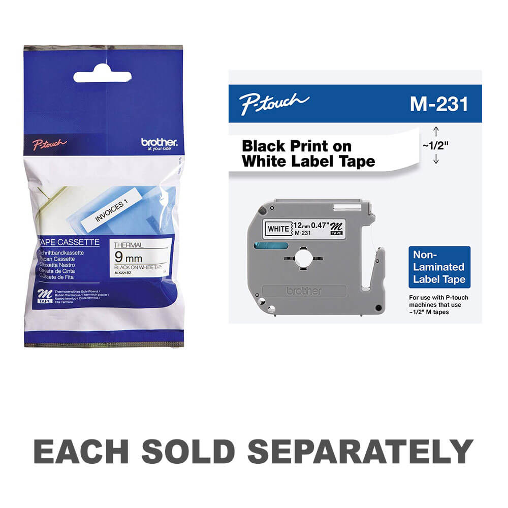 The P-touch M-231 ½” (0.47") black-on-white tape allows you to create bold, yet easy to read labels, that are easy to peel, perfect for indoor use. This half-inch (0.47-inch) standard direct thermal non-laminated P-touch Tape is resistant to water damage and will not smear or smudge. They have been designed to install seamlessly with Brother P-touch labelers. Brother M tape is compatible with 26 P-touch label printers and are perfect for labeling kitchen, shelving, and supply cabinets. This replacement label tape for Brother P-touch label printers has been engineered for simplicity. The Brother M-231 black and white labels are easy to print and apply to different surfaces. The split back of the P-touch tape can be removed with ease, which makes Brother M replacement label tape simple to peel and apply to tables and shelves made of steel, wood, plastic and more.
