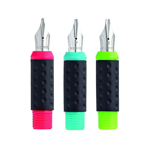 • Three colour-coded nibs for stroke variety: fine nib (pink), medium nib (teal), broad nib (lime green)