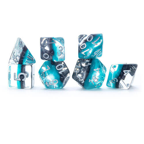 Midnight Black & Dreams of Teal - Silver Numbering. Eclipse Dice are layered dice (4) featuring two thin layers of bright pearlescent color nestled between two perfectly clear transparent outer layers!