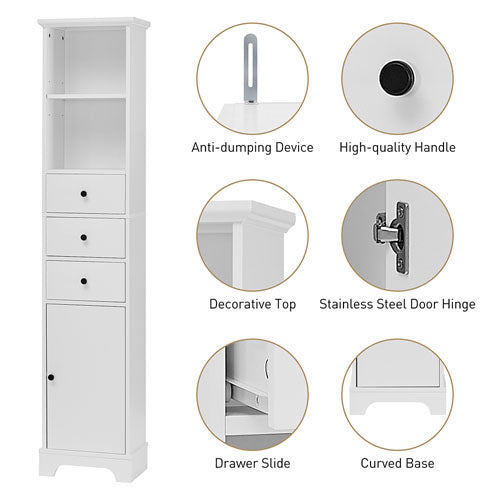 This cabinet features a painted finish, providing a water-proof, smooth, and easy-to-clean surface. The convenient metal black knobs make opening and closing the drawers and door a breeze.Experience the convenience of ample storage space with this cabinet. It offers open storage shelves, three spacious drawers, and an enclosed cabinet below. This allows you to neatly organize a wide range of daily essentials, keeping your room clean and tidy. The drawers are equipped with slides for smooth and effortless operation, enhancing your overall user experience.This tall storage cabinet not only prioritizes functionality but also boasts a simple and elegant design. The attention to detail, such as the decorative top, arc base, and groove pattern, adds a touch of grace and sophistication. Its versatile design makes it suitable for various environments, including the bathroom, kitchen, dining room, living room, bedroom, or study