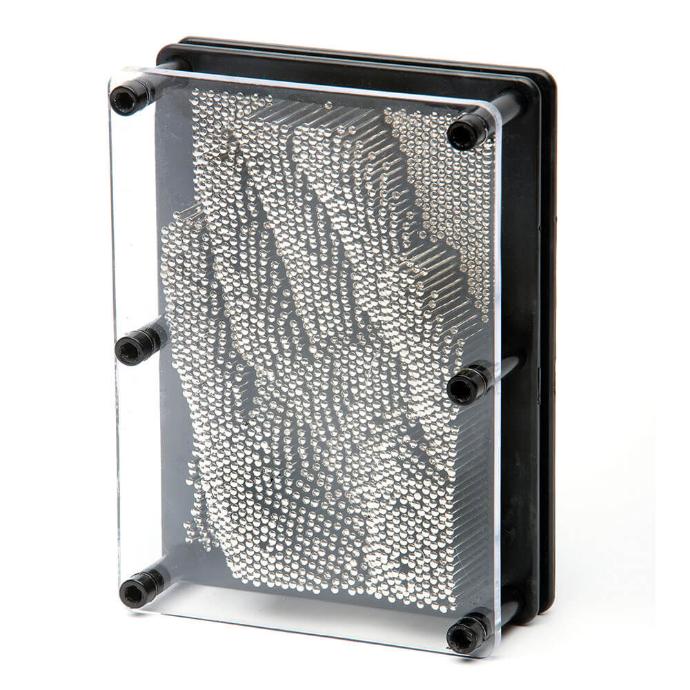 Lift the device to your face - or another appropriate part of your anatomy and gently press down on the thousands of metal pins to reveal a perfect 3D impression behind a Perspex panel.