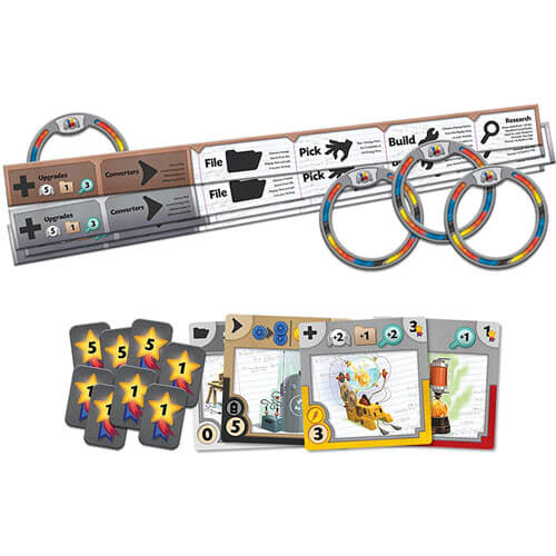 • Great replayability - players shuffle the Gizmos decks and only use a certain number of them Each game. With each play through, new options will be made available.
