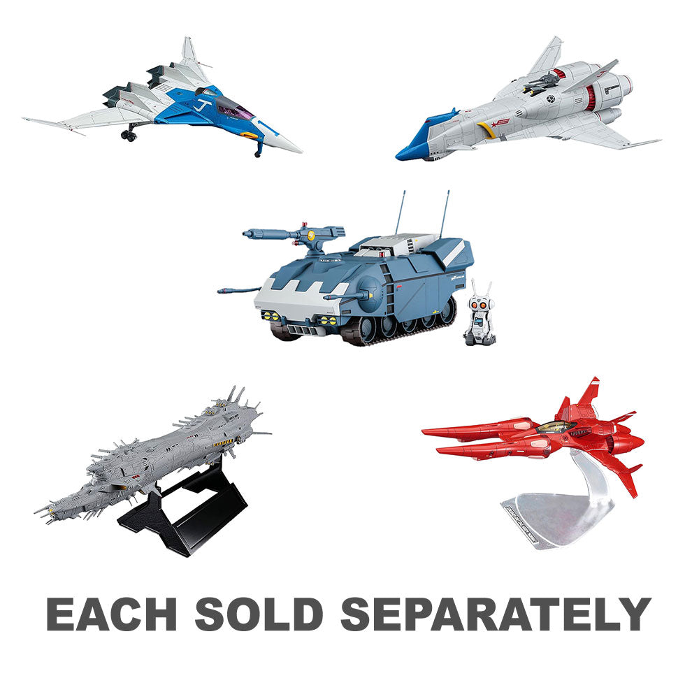 The bow and the periphery of the bridge are finely divided, and the complicated shape is accurately three-dimensionalized. The parts color is gray. Accurate parts division allows assembly without adhesive! It is designed to incorporate high-density panel line engraving. he large turret can be turned. Includes Minerva of the same scale and an assault boat (x 4). Fighter 1 / Fighter 2 also set with relief parts. An exhibition stand is included.