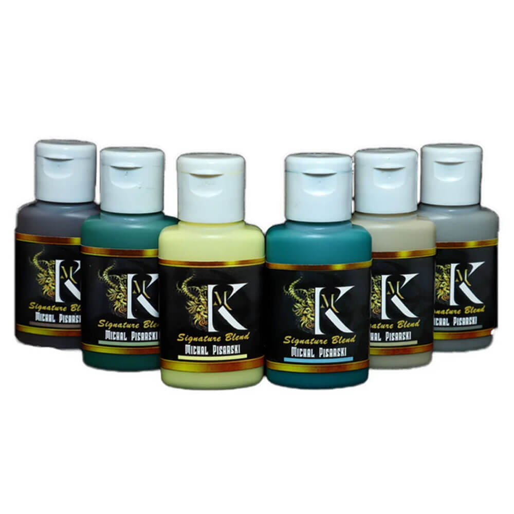 These paints have the kimera pigments in them, in heavy quantities as always. This means you get the power you are used to with the pure set and amazing coverage. They also mix perfectly well with the base set and they are a very good expansion for that. On top of this, there is the work of the artist behind the set. Because these are not just sets branded with the name of an artist on top. These paints were conceived freely by the artist and from conceptualizing them to the realization it took us more than 1 year of constant work. The artists involved worked side by side with us to create each of the 6 paints with the characteristics they wanted them to have in order to have the perfect paint for how they paint.