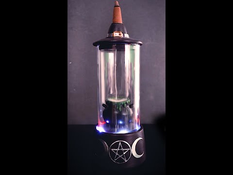 • Glass case backflow incense burner featuring a witch's hat and cauldron.