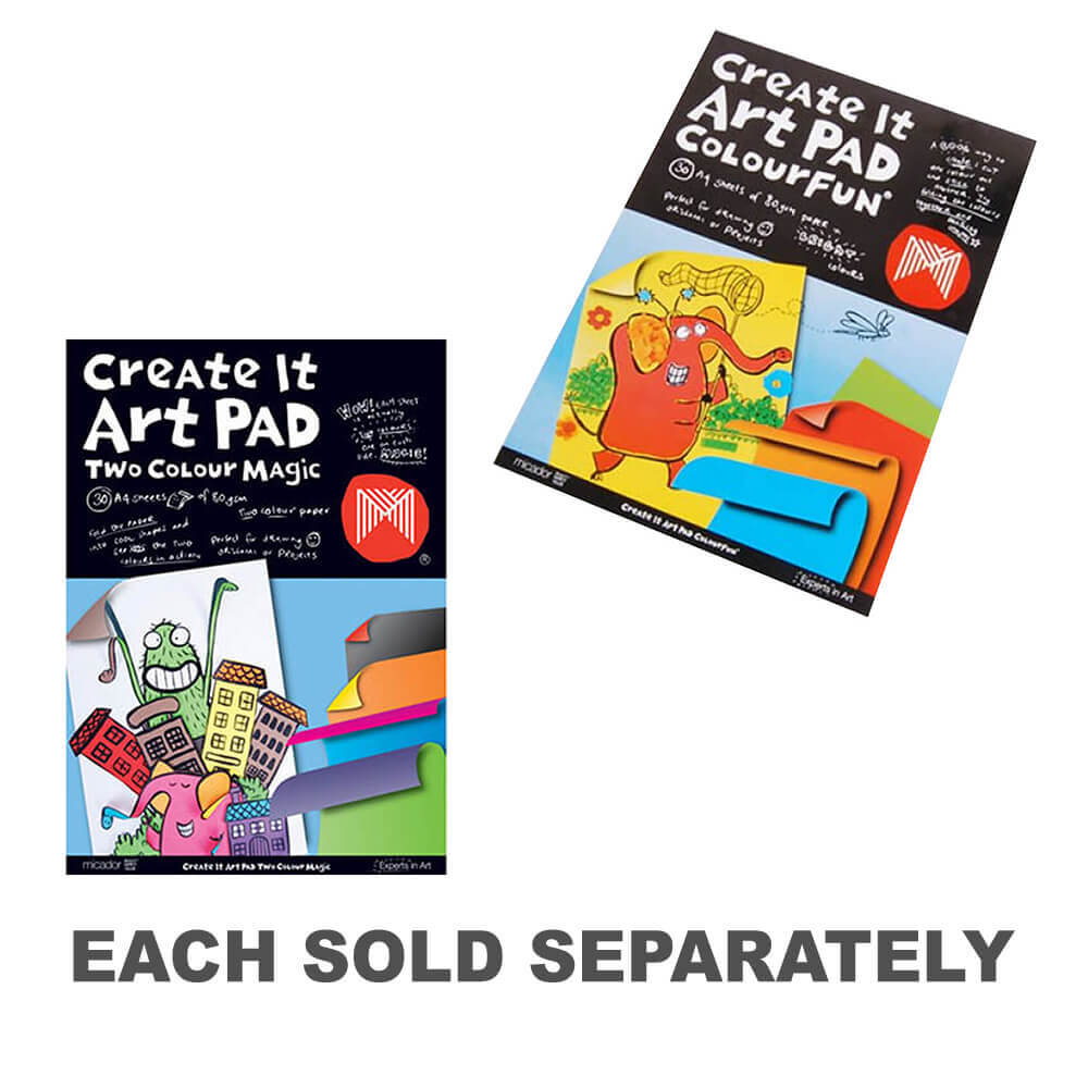 Additional Information: A4 Art Pads with 30 easy tear sheets of quality, acid free paper suitable for kids drawing, scrapbooking, craft projects and origami. 80gsm. Available in 3 different styles. Colourfun - five vibrant colours (aqua blue, red, orange, yellow and green). Two colour magic-10 colours, with a different colour to each side of the sheet (purple/green, yellow/orange, pink/blue, red/black and brown/white. Black and white-black and white paper. Alternating 5 sheets of white paper and 5 sheets of black paper. Barcode 9313306014833 Inner Barcode 9313306014833 Supplier Code KAB41 Brand MICADOR