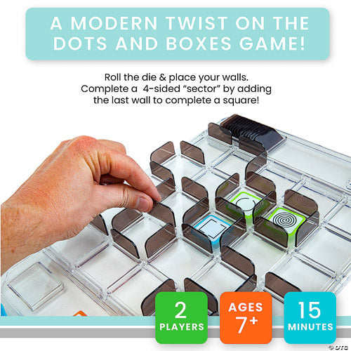 This modern board game is easy to learn but takes time to master. Based off the dots-and-squares game, children and parents alike will enjoy facing off. On each turn, roll a die and place your walls. Build and claim 4-sided "sectors" by placing the last wall to complete a 1x1 square. Try to block your opponent from claiming sectors or get lucky and draw special tiles that give you extra actions. Claim 5 sectors in a row and you've won Sectori! It's always an exciting brain challenge - whether it's your 4th or 40th round!