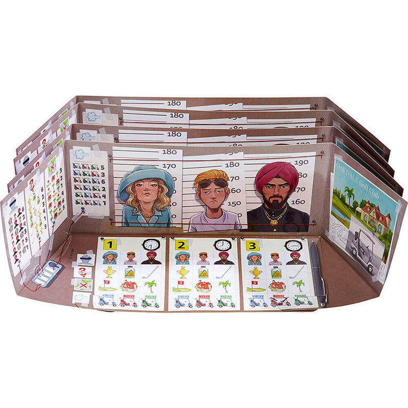 • Contents: 4 briefcase screens, 4 dry-erase markers with erasers, 4 investigation files, 9 wooden keys, 1 solution board, 190 cards: 100 witness statements and 90 lab cards (24 watch cards, 24 license plate cards, 24 DNA cards and 18 alibi cards).