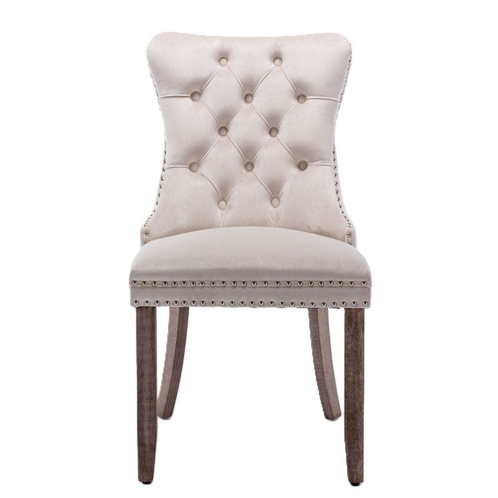 Add a touch of elegance to your dining space with this contemporary dining chair. It has a tufted design with wooden legs, which goes well with most interiors.This dining chair designed with a classic color scheme and well-crafted shape, features a stylish and gorgeous button and nailhead design. The decorative ring behind the back not only adds to its aesthetic appeal but also allows for easy pulling of the chair out.Made of velvet fabric, the modern dining chair features an ergonomic backrest that provides extra back support. The high-density sponge seat cushion adds extra comfort. They are versatile and suitable for various occasions.Equipped with 4 solid wood legs, modern dining chairs offer greater stability, withstanding up to 300 pounds. Its feet ensure the stool is balanced and protects your floor, preventing it from getting scratched.It is complete with all the needed hardware and accessories and the instruction is provided, which includes very detailed and concise installa