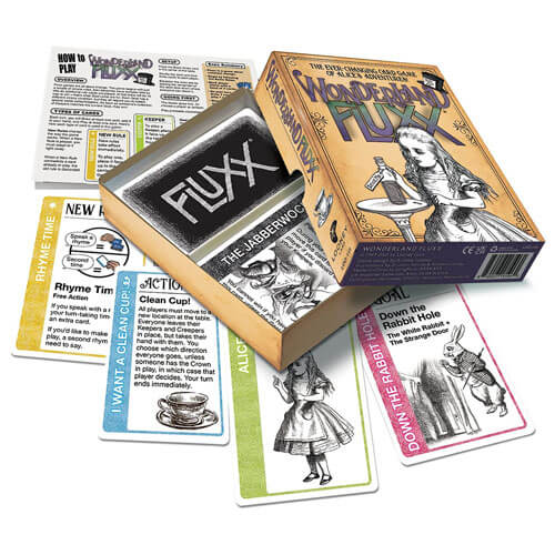 In Wonderland Fluxx, you get to go down the Rabbit Hole to join Alice as she has tea with the Mad Hatter, gets directions from the Cheshire Cat, tries to reason with Tweedle Dee and Tweedle Dum, and grows and shrinks alarmingly. You may even need to slay a Jabberwock to win at this even curiouser version of Fluxx...
